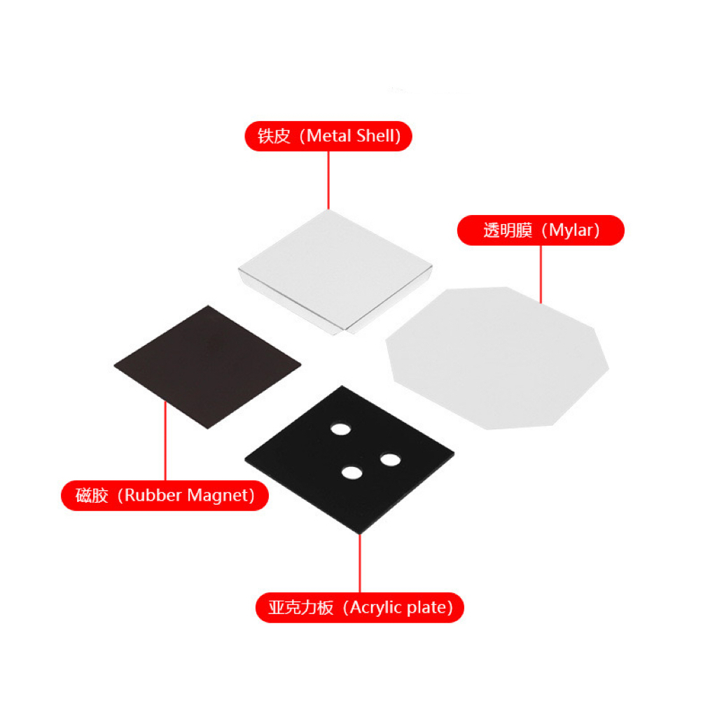 - Includes: metal backings, PVC boards, Mylar film, magnet sheets