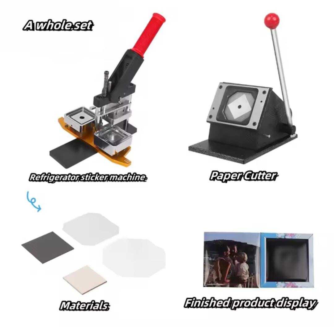 Next to the machines, your supplies. You chose the 100-pack (or was it the 1,000-pack?). Either way, you've got stacks of metal backings, PVC boards, Mylar film, and magnet sheets. Everything you need to create your first batch of custom photo magnets.